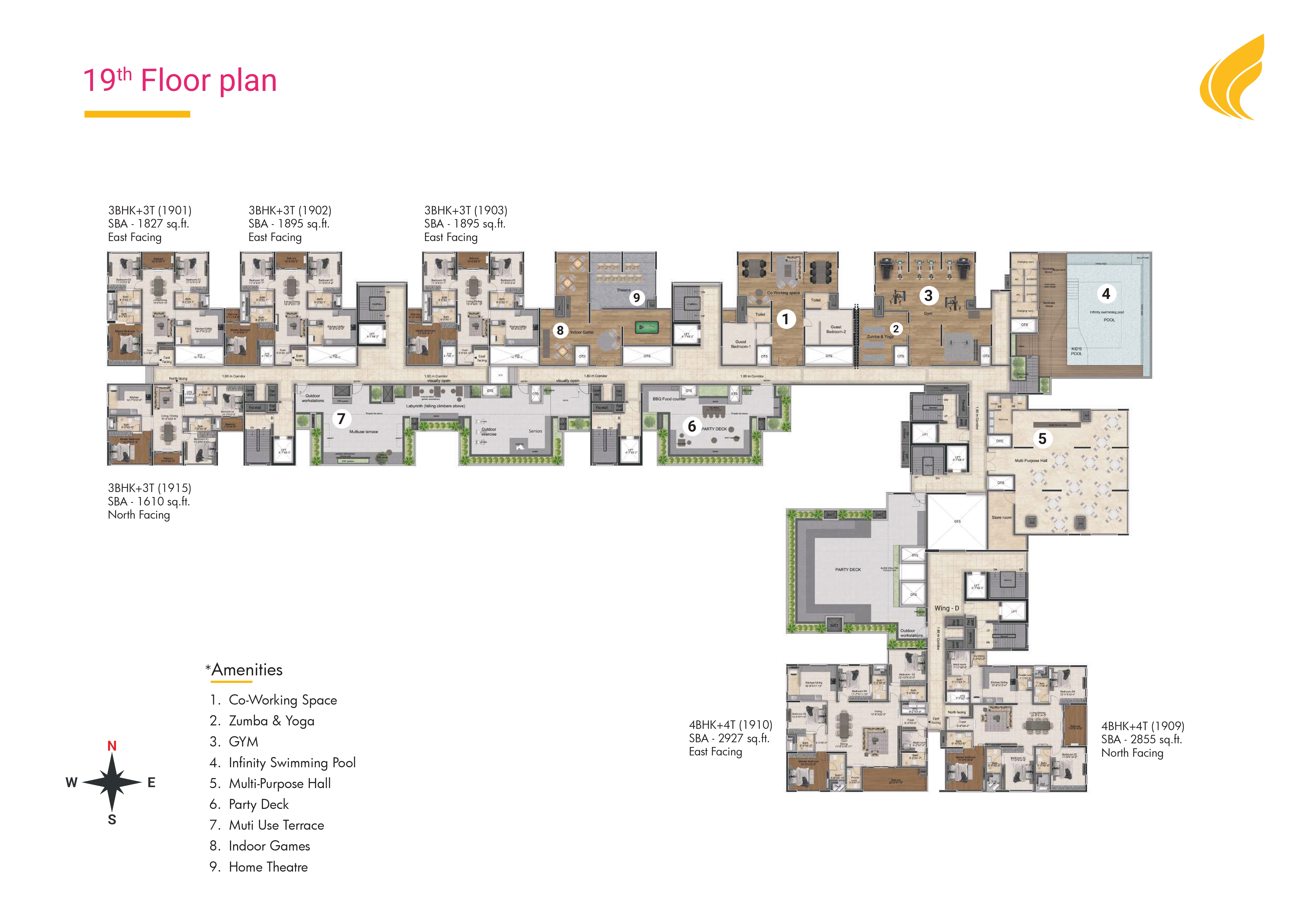 Each residence ranges between 1595 sq.ft. and 2927 sq.ft., ensuring there’s a perfect home for every family size and lifestyle preference. Every unit is vaastu-compliant, thoughtfully planned to maximize natural light, ventilation, and space efficiency, while also offering uninterrupted views of the Bay of Bengal and the vibrant cityscape.